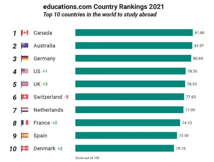 从榜单中,我们可以明确看到加拿大位居榜首,成为最受学生喜欢的留学国家。