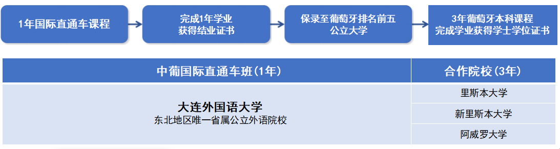葡萄牙著名公立大学13国际本科项目,是在中葡两国高等教育合作框架下,葡萄牙校方授权在大连外国语大学对学生开设专业语言课、欧洲通识课及大学本科基础课的教育。学生完成国内一年学习后,赴葡三年完成剩余学业,并获得葡萄牙著名高校(相当于国内“985”"双一流")颁发的学历学位证书,经中国教育部留学服务中心认证,可参公、考研,享受海归待遇。