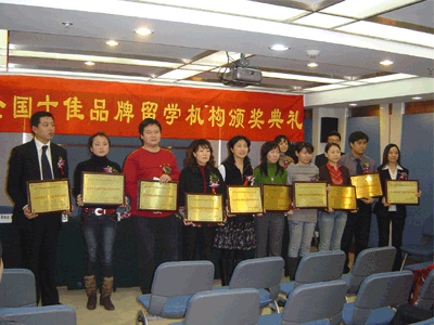 2007年1月31日,中青报首届品牌留学教育机构联展胜利落幕,在人民网、搜狐、育路网等多家媒体的大力支持下,中青报*中青在线2006年度首届品牌留学语言培训机构联展活动得到了广大网民的积极投票参与,经过专家组严格评审,选举出了全国范围的十大品牌留学机构,他们是(排名不分先后):澳际出国留学(出席:王东光)、 北京五湖中视咨询有限公司(环球雅思留学服务中心)、 北京和中联合投资有限公司(出席:毛琴)、北京艾迪国际教育发展有限公司(出席:毛婷婷)、北京樱知叶文化交流有限公司(出席:朴泰仙总经理)、广州启德教育集团(出席:刘彦海)、四川外语学院海外留学服务中心、浙江新通出国服务中心、宁波泓雄出国留学服务中心(出席:傅志强总经理)、 大连鑫泉科教咨询有限公司(出席:王娟娟)