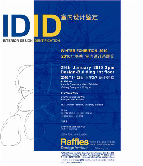 2010年1月29日下午3点,一场名为“IDID室内设计鉴定”的展览在东华大学-莱佛士国际设计专修学院设计楼隆重举行。著名旅美设计师王怡丰出席了展览,并对学生作品做了点评指导。