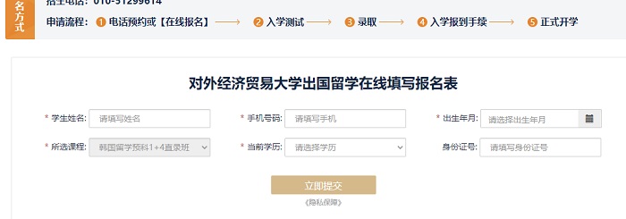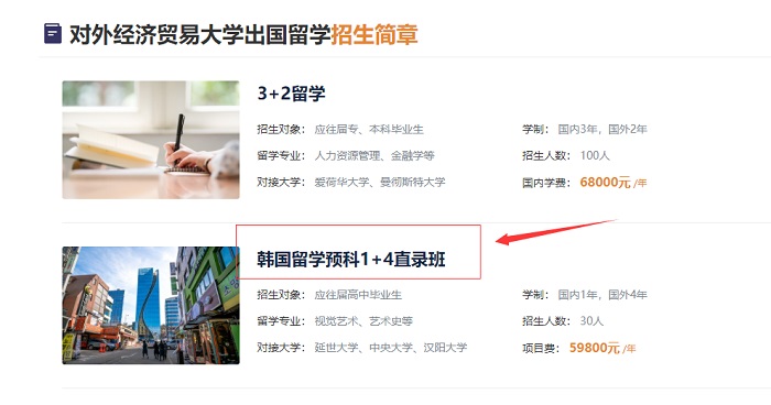 首先要登录育路出国留学网(cg.yuloo.com),首页点击“院校库”,选择“北京”地区,下拉页面找到“对外经济贸易大学”,点开进入招生简章,然后在简章找到“韩国留学预科1+4直录班”,点开进入,看完整个留学项目介绍后,填写页面最下方报名表即可。
