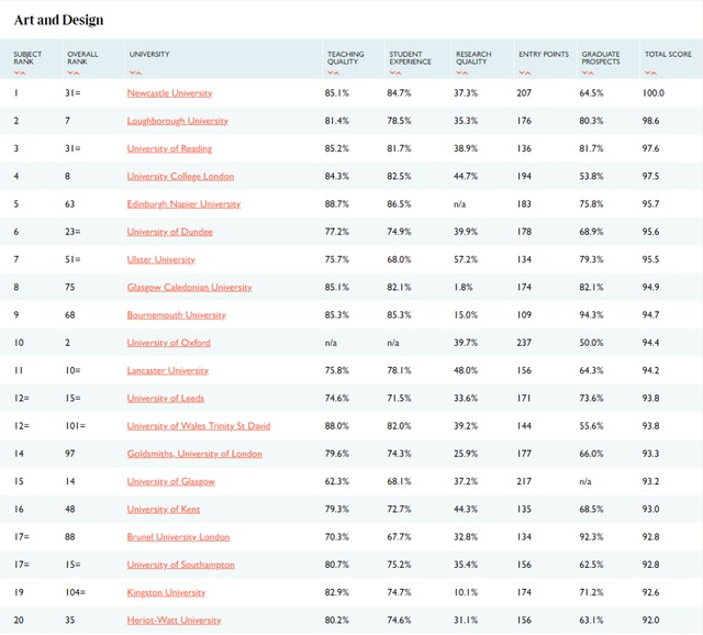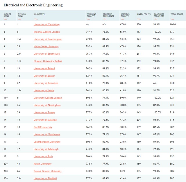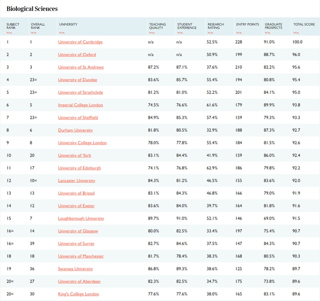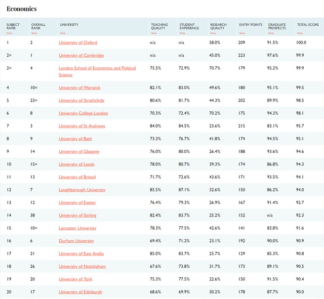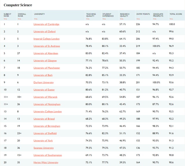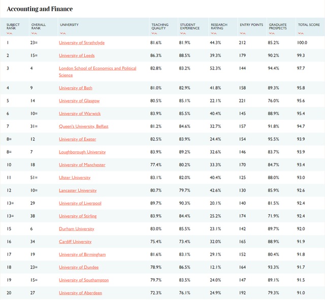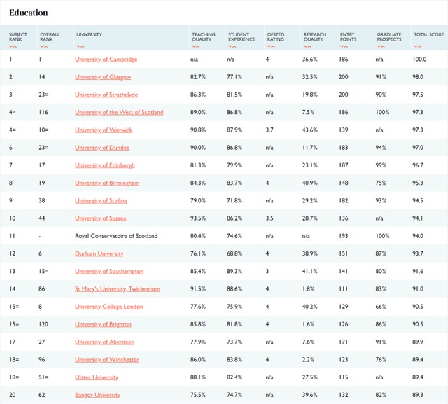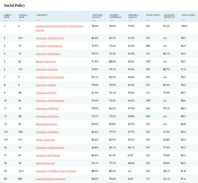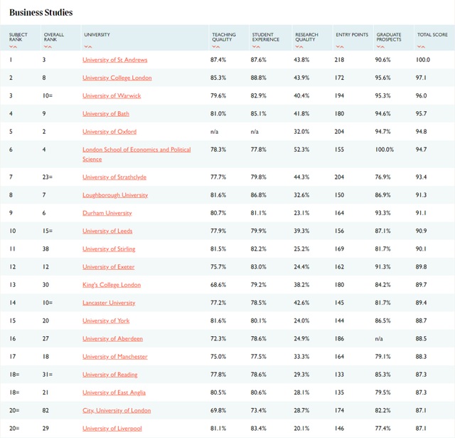 本次排名前三仍然是剑桥、牛津、圣安,LSE上升至第四名,帝国理工第五名,G5的另一所大学UCL排名第8,杜伦、拉夫堡、兰卡继续保持在前10,分别位居第6、7、10。今年的前10增加了巴斯大学,从去年的11升至第九名。最后值得一提的黑马是爱丁堡大学,去年25名,今年大跨步至18名达到前20。