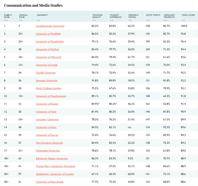 高权威高知名度的Times是最早开始制作大学排名的媒体,一直以来申请英国学校的同学们都以它作为重要的参考指标,因为泰晤士排名相比其他榜单更注重学校的学术能力,这也是中国学生一直列为重点的关注指标之一。泰晤士排名指标包括:Teaching quality:教学质量、Student experience:学生体验、Research quality :研究质量、Entry standards (Ucas pts):入学要求、Graduate prospects :就业前景、Firsts/2:1s:一等/二等一学位数、Completion rate:学位完成率、Student-staff ratio:师生比、Services/facilities spend:服务/设施经费投入。