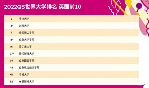 2022年QS世界大学排名榜单已经公布,英国大学排名榜单也已经被单独划出来公布。喜人的是英国大学2022年世界排名稳中求进,有四所大学跻身世界大学top10,其中牛津、剑桥分列世界第二、三名。备受国内留学生喜欢的帝国理工、伦敦大学、爱丁堡大学、曼切斯特大学也获得不错的排名,排名详情如下:
