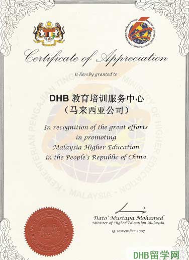 由于DHB留学机构在推广马来西亚高等教育方面的杰出贡献,2007年11月,马来西亚高等教育部授予DHB留学机构推广马来西亚高等教育的“杰出贡献奖”,时任高教部部长的穆斯塔发。默哈莫德先生亲自颁奖。